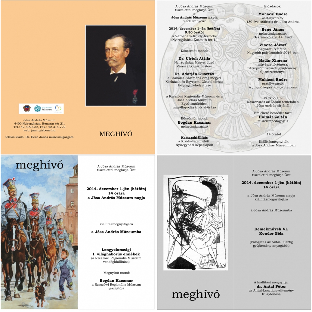 A Jósa András Múzeum kulturális szerepe mindig kiemelkedő volt a társadalom szempontjából. Értékmegőrző, értékteremtő szerepével hozzájárult a nemzet kultúrájához, örökségéhez, identitásának kialakításához. December 1-jén, 9 óra 30-kor a Városháza Krúdy-termében Jósa András születésének 180., valamint a róla elnevezett múzeum megalapításának 146. évfordulója tiszteletére immár tizedik alkalommal kerül megrendezésre a Jósa András Múzeum Napja, ahol felidézik a múzeum múltját és értékelik az intézmény idei évét. A múzeum munkatársai, önkéntes segítők és múzeumbarátok minden év végén közösen tisztelegnek a névadó orvos-polihisztor előtt. Az idei rendezvényt Dr. Ulrich Attila Nyíregyháza Megyei Jogú Város alpolgármestere és Dr. Adorján Gusztáv, a Szabolcs-Szatmár-Bereg megyei Kórházak és Egyetemi Oktatókórház főigazgató-helyettese nyitják meg. Sor kerül a Rzeszówi Regionális Múzeum és a Jósa András Múzeum együttműködési megállapodásának aláírására, melynek keretében Bogdan Kaczmar múzeumigazgató mond köszöntőt. Az ünnepségenDr. Bene János múzeumigazgató, Mohácsi Endre osztályvezető, Madár Ximena művészettörténész és Vincze József pályázati referens tartanak előadást. 12 óra 30-tól koszorúzásra kerül sor az Északi temetőben Jósa András sírjánál, ahol Holmár Zoltán múzeumpedagógus tart emlékező beszédet. A múzeum napja alkalmából két tárlat is nyílik: az egyik a Rzeszówi Regionális Múzeum vendégkiállítása, mely „Lengyelországi I. világháborús emlékek” címet viseli, míg a másik a „Remekművek VI. – Kondor Béla festészete” című kiállítás az Antal-Lusztig gyűjtemény darabjaiból. Az ünnepségen meglepetés is várható.