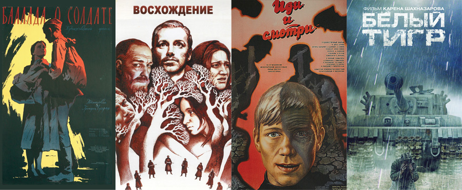 A filmtörténeti művek közül az első a Grigorij Csuhraj rendezte Ballada a katonáról (Ballada a szoldatye, 1959). A hruscsovi olvadás alatt megújuló, költői realista szovjet filmművészet egyik első remeke kivételes érzékenységgel ragadja meg, hogy minden ember egy külön világ, értelmetlen pusztulása ezért különösen tragikus. Aljosa története egyben azok sorsát is példázza, akik készek áldozatokat hozni, emiatt a saját életükre nem marad idejük. Larisza Sepityko Kálvária (Voszhozsgyenyije, 1976) című, Vaszil Bikov írásából készült drámájának tematikai újdonsága, hogy bemutat a fasisztákkal kollaboráns figurákat, rendfenntartó, partizánok ellen is bevethető egységeket. Erkölcsi drámaként és dilemmaként közelíti meg az árulás és az önfeláldozás kérdését, kíméletlenül puritán képalkotással. Elem Klimov Jöjj és lásd! (Igyi i szmotri, 1985) című tablója apokaliptikus, végtelennek tűnő ábrázolása egy megtorló akciónak. Felkavaró beszámoló a háborúkban zajló teljes elállatiasodásról, amely alól az igazság oldalán állók, a hazájukat, otthonukat védők és a gyerekek sem vonhatják ki magukat. A 2012-es Fehér Tigris (Belij Tyigr) Karen Sahnazarov rendezésében filozofikus, háborús akciófilm: keserű látomás a háború végtelenségéről. A pusztítás úgy terjed, mint valamilyen titokzatos erő, amelyről nem tudni, mivé fajul.
