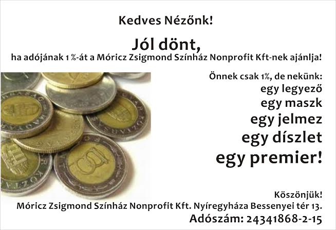 A Móricz Zsigmond Színház Társulata májusban is szeretettel vár mindenkit az előadásokra, és arra kéri színházbarát nézőit, hogy adójának 1%-át a Móricz Zsigmond Színház Nonprofit Kft-nek ajánlja! Önnek csak 1 %, de nekik: egy legyező, egy maszk, egy jelmez, egy díszlet, egy premier! Köszönjük! (Adószám: 243418682 - 2 - 15)