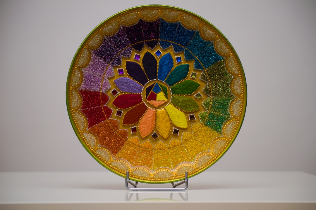 Üveg tálakra festettem különféle szimbólumokat, formákat, így születtek a képeken látható energetizáló mandalák.